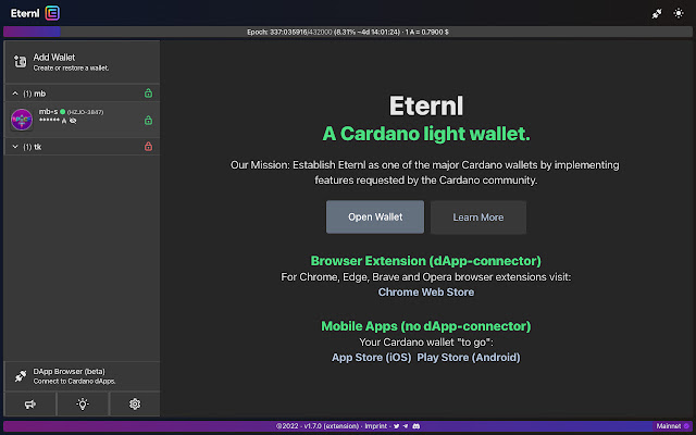 Eternl es una Wallet nativa de Cardano, se ha convertido en una opción muy interesante y segura para delegar porque al igual que Yoroi, es una billetera ligera y fácil de usar, en el caso de Eternl conseguirás un par de opciones que la hacen incluso más versátil que Yoroi.